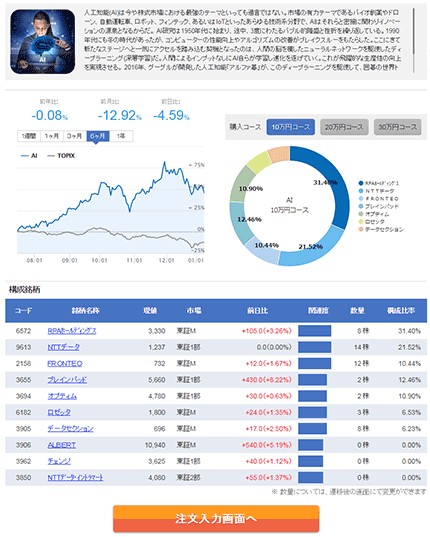 気になったテーマをクリックすれば、そのテーマの詳細や構成銘柄、コースの選択、テーマを購入する注文画面に進むボタンなどが表示されます。