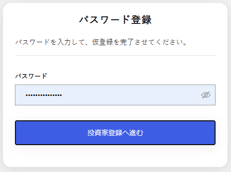 パスワード登録画面でCAMPFIRE Angelsにログインするパスワードを決めて、投資家登録に進みます。(ログインIDはメールアドレスになります)