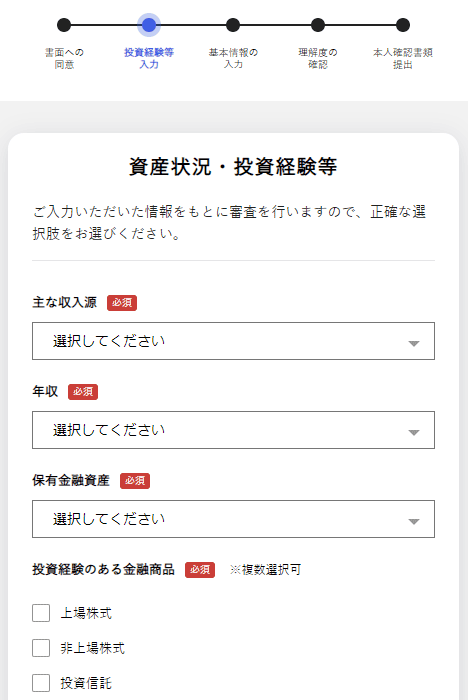 「投資家情報の入力」は、あなたの投資家としての情報の入力で、投資経験や資産などを入力します。