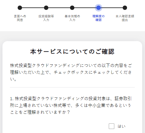 「理解度の確認」は、株式投資型クラウドファンディングがどのようなものか理解しているかの確認です。読んでチェックを入れていくだけなので簡単です。